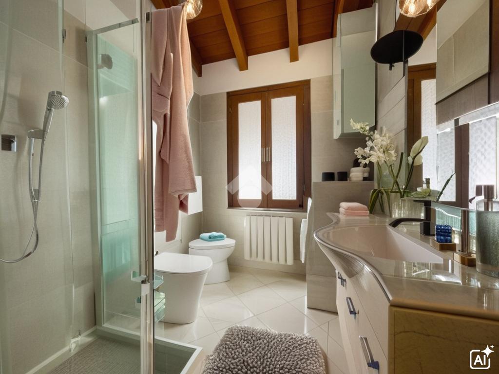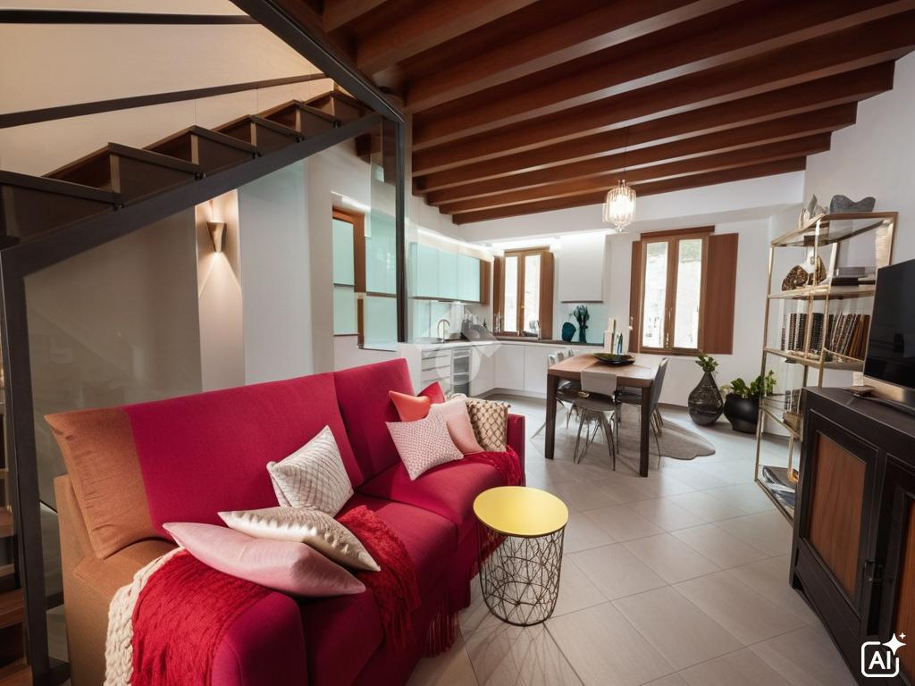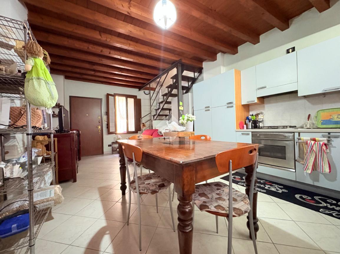 Al piano terra troviamo un luminoso soggiorno con cucina a vista in soluzione open space, ben finestrato, con scala interna in legno che conduce al piano superiore.