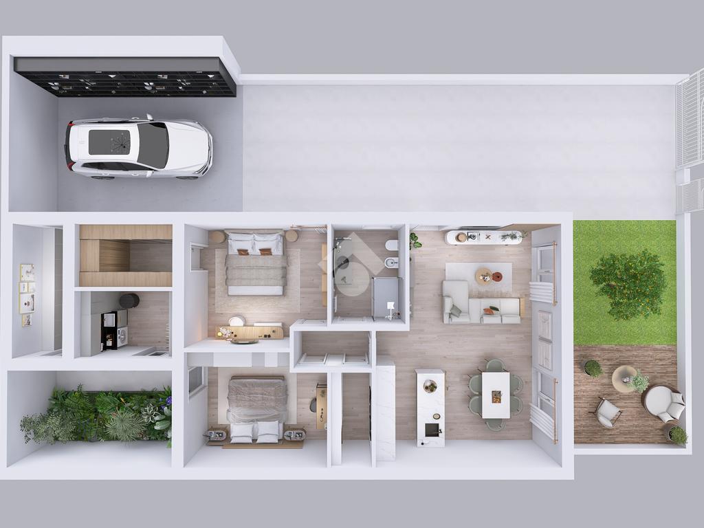 La zona notte ospita una camera matrimoniale con cabina armadio e accesso diretto al giardino privato, oltre a una seconda spaziosa camera doppia/matrimoniale con uscita su una comoda terrazza esterna, ideale per momenti di relax.